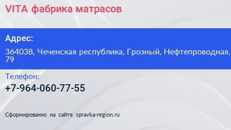 VITA, фабрика матрасов по адресу 364038, Чеченская республика, Грозный, Нефтепроводная, 79 в дальнейшем Организация, размещена в следующих категориях: