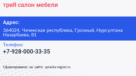 триЯ, салон мебели по адресу 364024, Чеченская республика, Грозный, Нурсултана Назарбаева, 81 в дальнейшем Организация, размещена в следующих категориях: