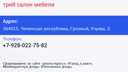 триЯ, салон мебели по адресу 364015, Чеченская республика, Грозный, Узуева, 2 в дальнейшем Организация, размещена в следующих категориях: