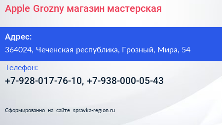 Apple Grozny, магазин-мастерская по адресу 364024, Чеченская республика, Грозный, Мира, 54 в дальнейшем Организация, размещена в следующих категориях: