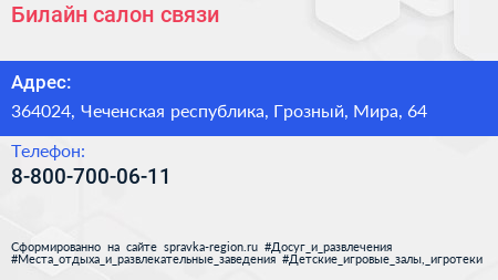 Билайн, салон связи по адресу 364024, Чеченская республика, Грозный, Мира, 64 в дальнейшем Организация, размещена в следующих категориях: