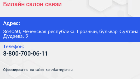 Билайн, салон связи по адресу 364060, Чеченская республика, Грозный, бульвар Султана Дудаева, 9 в дальнейшем Организация, размещена в следующих категориях: