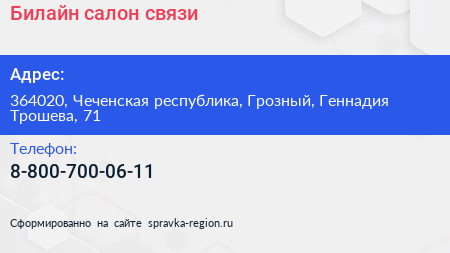 Билайн, салон связи по адресу 364020, Чеченская республика, Грозный, Геннадия Трошева, 71 в дальнейшем Организация, размещена в следующих категориях: