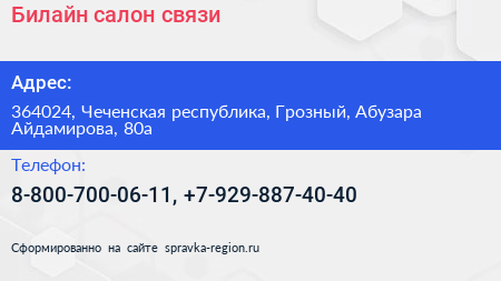Билайн, салон связи по адресу 364024, Чеченская республика, Грозный, Абузара Айдамирова, 80а в дальнейшем Организация, размещена в следующих категориях: