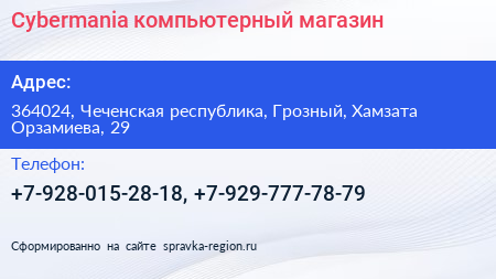 Cybermania, компьютерный магазин по адресу 364024, Чеченская республика, Грозный, Хамзата Орзамиева, 29 в дальнейшем Организация, размещена в следующих категориях: