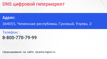 DNS, цифровой гипермаркет по адресу 364015, Чеченская республика, Грозный, Узуева, 2 в дальнейшем Организация, размещена в следующих категориях: