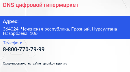 DNS, цифровой гипермаркет по адресу 364024, Чеченская республика, Грозный, Нурсултана Назарбаева, 106 в дальнейшем Организация, размещена в следующих категориях: