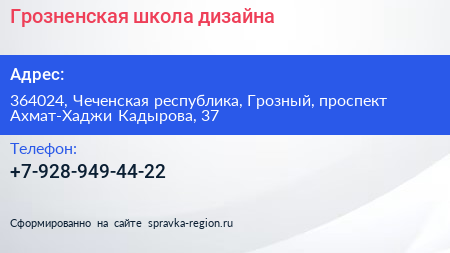 Грозненская школа дизайна по адресу 364024, Чеченская республика, Грозный, проспект Ахмат-Хаджи Кадырова, 37 в дальнейшем Организация, размещена в следующих категориях: