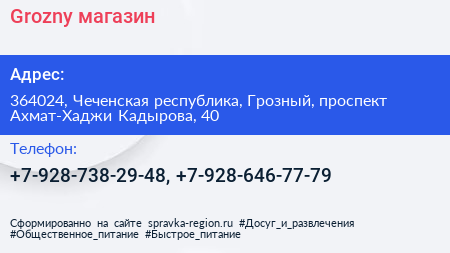 Grozny, магазин по адресу 364024, Чеченская республика, Грозный, проспект Ахмат-Хаджи Кадырова, 40 в дальнейшем Организация, размещена в следующих категориях: