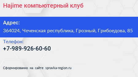 Hajime, компьютерный клуб по адресу 364024, Чеченская республика, Грозный, Грибоедова, 85 в дальнейшем Организация, размещена в следующих категориях: