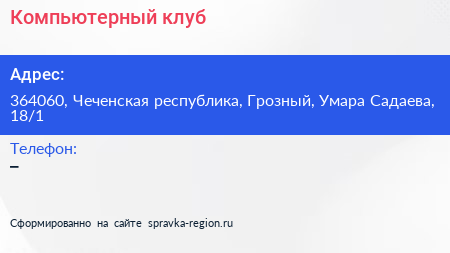 Компьютерный клуб по адресу 364060, Чеченская республика, Грозный, Умара Садаева, 18/1 в дальнейшем Организация, размещена в следующих категориях:
