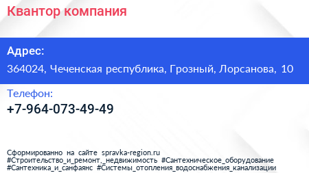 Квантор, компания по адресу 364024, Чеченская республика, Грозный, Лорсанова, 10 в дальнейшем Организация, размещена в следующих категориях: