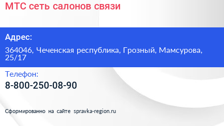 МТС, сеть салонов связи по адресу 364046, Чеченская республика, Грозный, Мамсурова, 25/17 в дальнейшем Организация, размещена в следующих категориях: