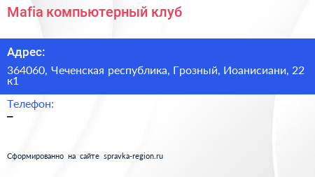 Mafia, компьютерный клуб по адресу 364060, Чеченская республика, Грозный, Иоанисиани, 22 к1 в дальнейшем Организация, размещена в следующих категориях: