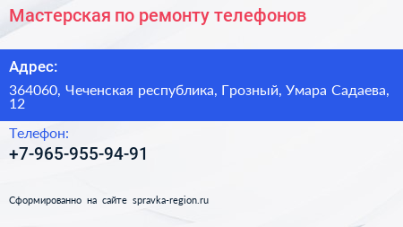 Мастерская по ремонту телефонов по адресу 364060, Чеченская республика, Грозный, Умара Садаева, 12 в дальнейшем Организация, размещена в следующих категориях: