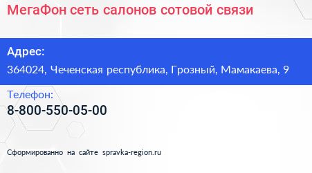 МегаФон, сеть салонов сотовой связи по адресу 364024, Чеченская республика, Грозный, Мамакаева, 9 в дальнейшем Организация, размещена в следующих категориях: