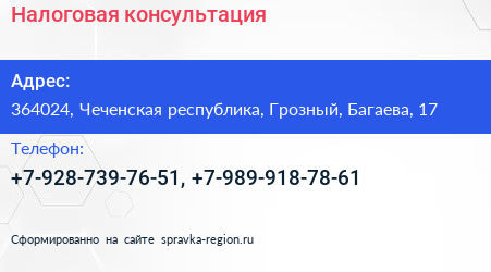 Налоговая консультация по адресу 364024, Чеченская республика, Грозный, Багаева, 17 в дальнейшем Организация, размещена в следующих категориях: