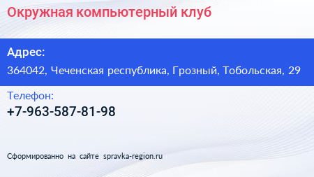 Окружная, компьютерный клуб по адресу 364042, Чеченская республика, Грозный, Тобольская, 29 в дальнейшем Организация, размещена в следующих категориях: