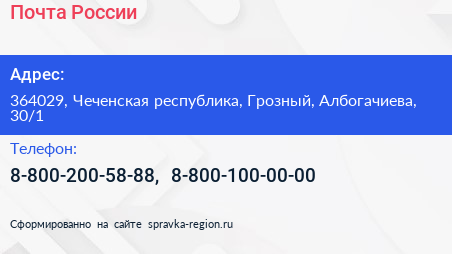 Почта России по адресу 364029, Чеченская республика, Грозный, Албогачиева, 30/1 в дальнейшем Организация, размещена в следующих категориях:
