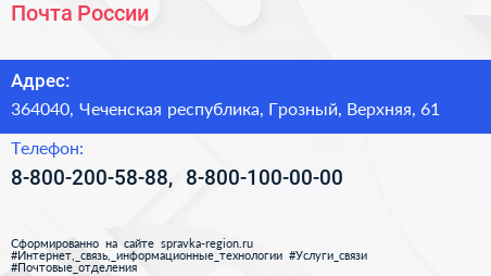Почта России по адресу 364040, Чеченская республика, Грозный, Верхняя, 61 в дальнейшем Организация, размещена в следующих категориях: