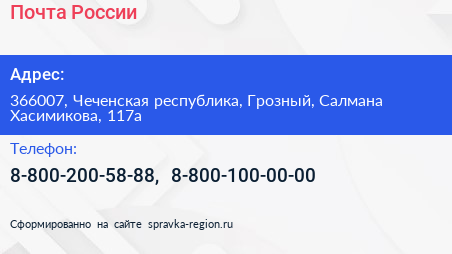 Почта России по адресу 366007, Чеченская республика, Грозный, Салмана Хасимикова, 117а в дальнейшем Организация, размещена в следующих категориях: