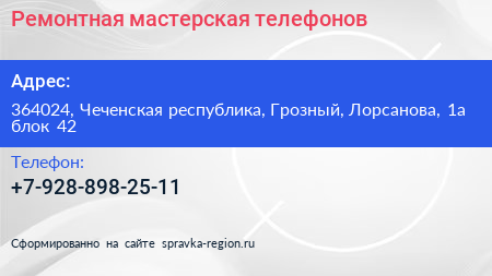 Ремонтная мастерская телефонов по адресу 364024, Чеченская республика, Грозный, Лорсанова, 1а блок 42 в дальнейшем Организация, размещена в следующих категориях:
