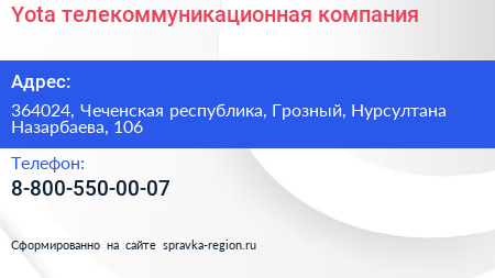 Yota, телекоммуникационная компания по адресу 364024, Чеченская республика, Грозный, Нурсултана Назарбаева, 106 в дальнейшем Организация, размещена в следующих категориях: