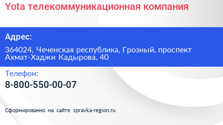 Yota, телекоммуникационная компания по адресу 364024, Чеченская республика, Грозный, проспект Ахмат-Хаджи Кадырова, 40 в дальнейшем Организация, размещена в следующих категориях: