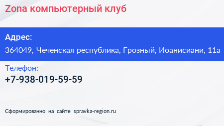 Zona, компьютерный клуб по адресу 364049, Чеченская республика, Грозный, Иоанисиани, 11а в дальнейшем Организация, размещена в следующих категориях: