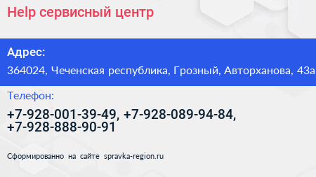 Help, сервисный центр по адресу 364024, Чеченская республика, Грозный, Авторханова, 43а в дальнейшем Организация, размещена в следующих категориях: