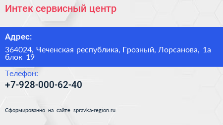 Интек, сервисный центр по адресу 364024, Чеченская республика, Грозный, Лорсанова, 1а блок 19 в дальнейшем Организация, размещена в следующих категориях: