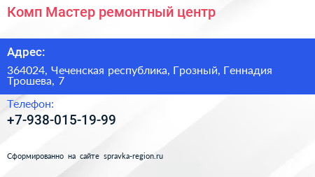 Комп Мастер, ремонтный центр по адресу 364024, Чеченская республика, Грозный, Геннадия Трошева, 7 в дальнейшем Организация, размещена в следующих категориях: