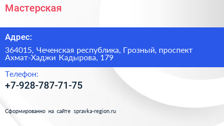 Мастерская по адресу 364015, Чеченская республика, Грозный, проспект Ахмат-Хаджи Кадырова, 179 в дальнейшем Организация, размещена в следующих категориях: