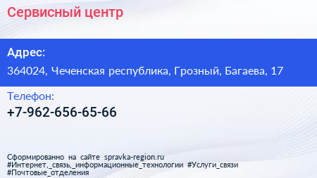 Сервисный центр по адресу 364024, Чеченская республика, Грозный, Багаева, 17 в дальнейшем Организация, размещена в следующих категориях: