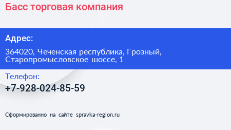 Басс, торговая компания по адресу 364020, Чеченская республика, Грозный, Старопромысловское шоссе, 1 в дальнейшем Организация, размещена в следующих категориях: