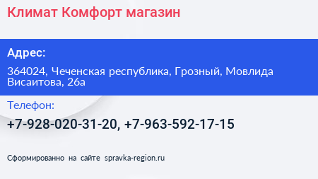 Климат Комфорт, магазин по адресу 364024, Чеченская республика, Грозный, Мовлида Висаитова, 26а в дальнейшем Организация, размещена в следующих категориях: