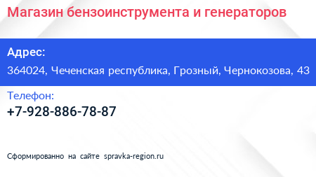 Магазин бензоинструмента и генераторов по адресу 364024, Чеченская республика, Грозный, Чернокозова, 43 в дальнейшем Организация, размещена в следующих категориях:
