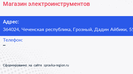 Магазин электроинструментов по адресу 364024, Чеченская республика, Грозный, Дадин Айбики, 55 в дальнейшем Организация, размещена в следующих категориях:
