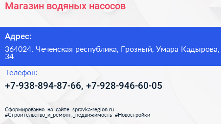 Магазин водяных насосов по адресу 364024, Чеченская республика, Грозный, Умара Кадырова, 34 в дальнейшем Организация, размещена в следующих категориях: