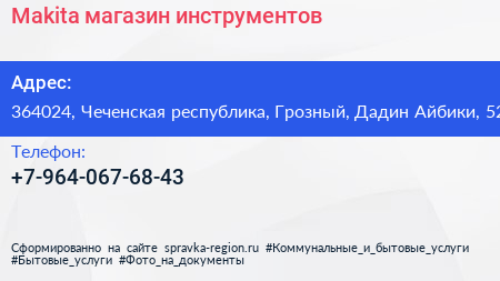 Makita, магазин инструментов по адресу 364024, Чеченская республика, Грозный, Дадин Айбики, 52 в дальнейшем Организация, размещена в следующих категориях:
