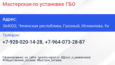 Мастерская по установке ГБО по адресу 364022, Чеченская республика, Грозный, Исмаилова, 9а в дальнейшем Организация, размещена в следующих категориях: