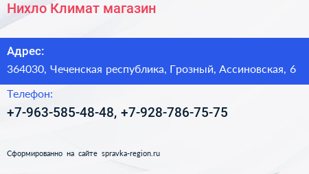 Нихло Климат, магазин по адресу 364030, Чеченская республика, Грозный, Ассиновская, 6 в дальнейшем Организация, размещена в следующих категориях:
