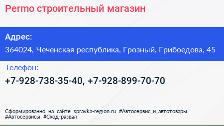 Permo, строительный магазин по адресу 364024, Чеченская республика, Грозный, Грибоедова, 45 в дальнейшем Организация, размещена в следующих категориях: