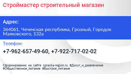 Строймастер, строительный магазин по адресу 364061, Чеченская республика, Грозный, Городок Маяковского, 132а в дальнейшем Организация, размещена в следующих категориях: