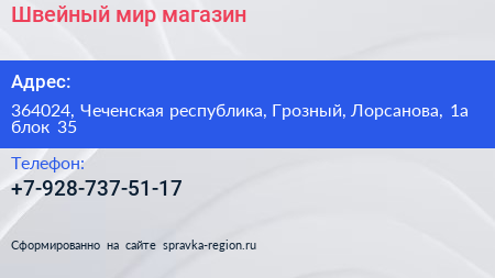 Швейный мир, магазин по адресу 364024, Чеченская республика, Грозный, Лорсанова, 1а блок 35 в дальнейшем Организация, размещена в следующих категориях: