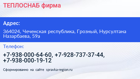 ТЕПЛОСНАБ, фирма по адресу 364024, Чеченская республика, Грозный, Нурсултана Назарбаева, 59а в дальнейшем Организация, размещена в следующих категориях: