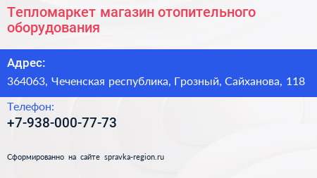 Тепломаркет, магазин отопительного оборудования по адресу 364063, Чеченская республика, Грозный, Сайханова, 118 в дальнейшем Организация, размещена в следующих категориях:
