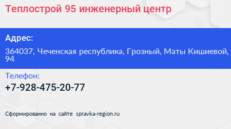Теплострой 95, инженерный центр по адресу 364037, Чеченская республика, Грозный, Маты Кишиевой, 94 в дальнейшем Организация, размещена в следующих категориях: