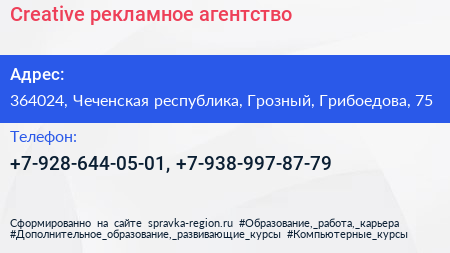 Creative, рекламное агентство по адресу 364024, Чеченская республика, Грозный, Грибоедова, 75 в дальнейшем Организация, размещена в следующих категориях: