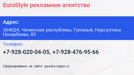 EuroStyle, рекламное агентство по адресу 364024, Чеченская республика, Грозный, Нурсултана Назарбаева, 85 в дальнейшем Организация, размещена в следующих категориях: